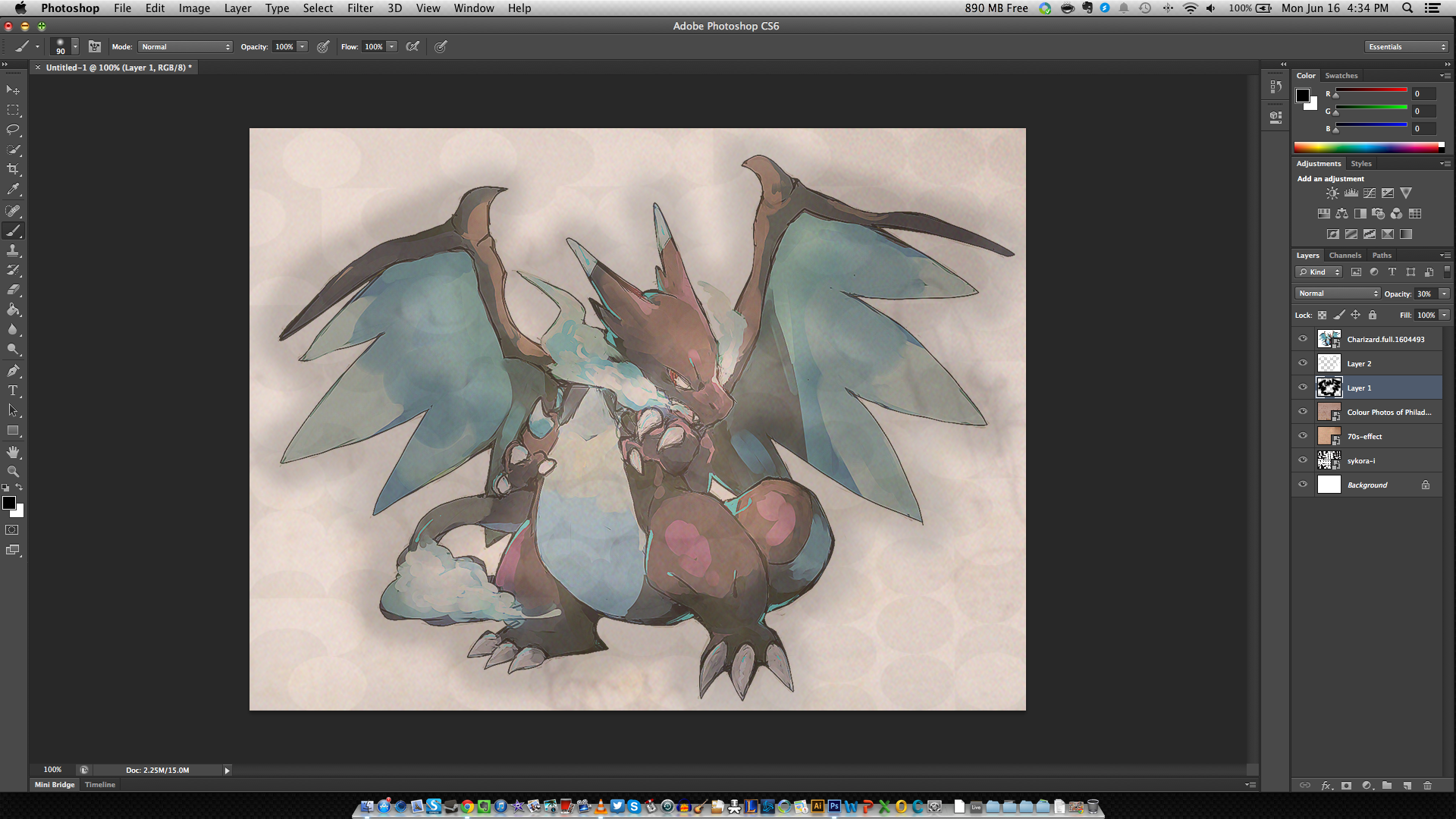 Here I did a lot of the same. Went on google and searched for some old school photographs to find that grainy yellow look. Found a few that worked and just cut out what I needed. I put all those behind the Charizard pic and messed around with the opacities. Did the same effect with the paintbrush tool too. Just this time went with a black outline instead of a white one. I like the first one I did more but this one fits the assignment better.